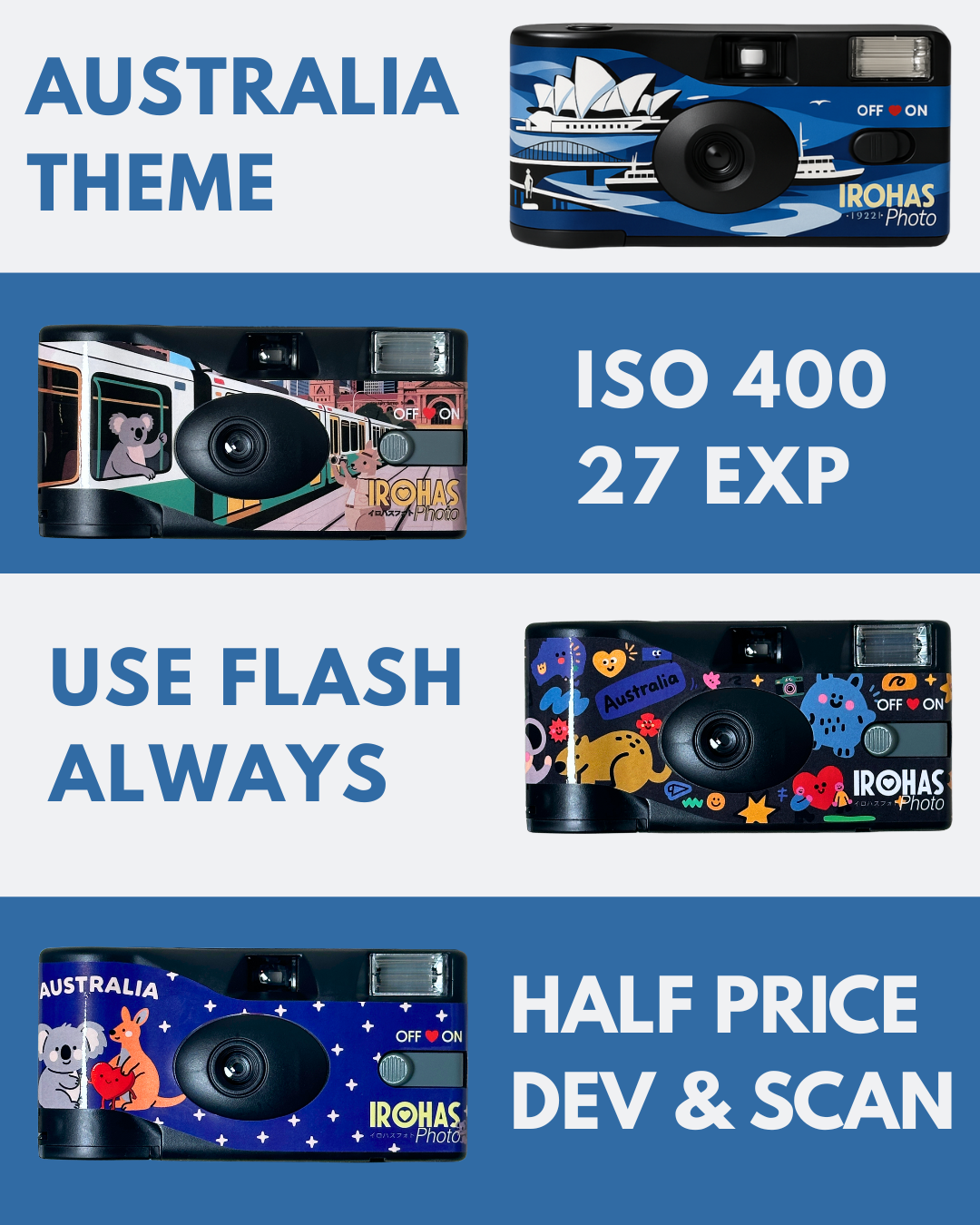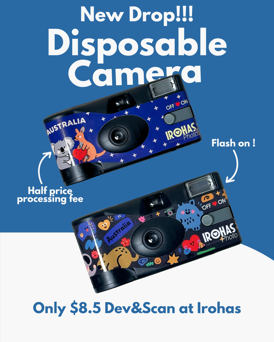 Irohas Single Use Cameras are just $35.99 each—available online or in our Melbourne, Sydney and Perth labs.